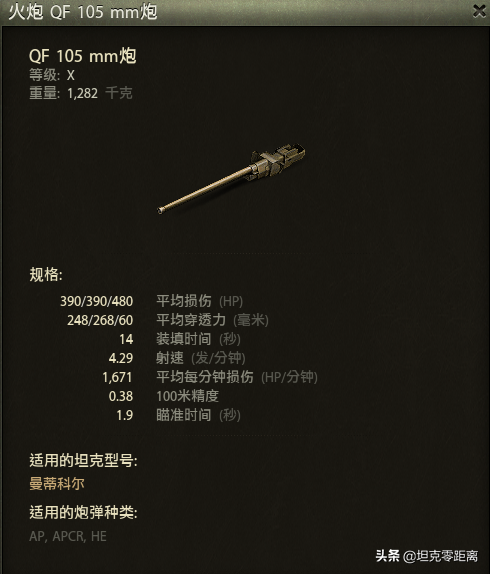 曼迪科尔装备一门帅气的105炮,但是有着非常拉胯的基础DPM,裸车要14秒才能装一发均伤390的炮弹,1671的DPM拉出去真是让人笑话,这也符合Y系轻坦一贯的“贫弱火力”传统,且好在炮控还算能玩,0.38的精度和1.9秒的缩圈手感尚可(还是会偶尔神经炮)。
