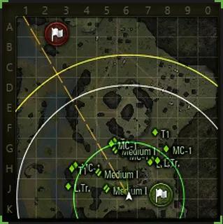 3、小地图。战场地图标有双方的基地和坦克。您的坦克将以白色图标显示,并附有观察范围圈和镜头方向锥。您可长按Ctrl键并点击小地图方格,以便引起队友注意。您可使用+和–键调整小地图的大小。