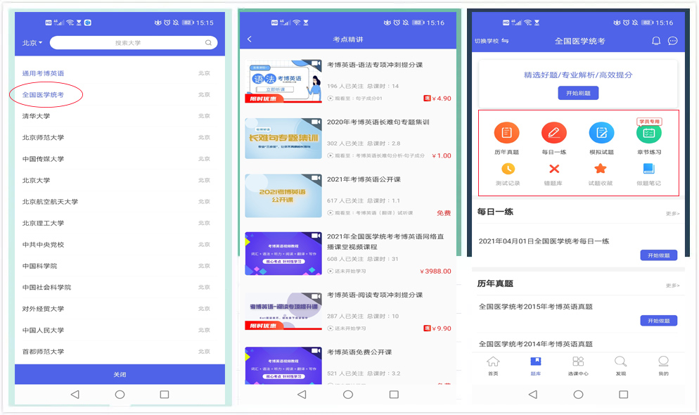 这是一款专门针对医学考博的APP。当然,也可以选择考博英语科目。相较于其他的备考软件来说,这个兼备专业性和全面性。我最喜欢的还是他的内容。里面实现了听课刷题一站式备考,我不用再听课和做题之间疯狂切换了,方便的很。他的备考资料和课程都是比较丰富和优惠的,最近也推出了限时优惠课程,可以说是性价比最高的备考App了。