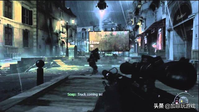就在此时,尤里的耳机中却出现了马卡洛夫的声音,马卡洛夫与尤里的对话表明他们以前就熟识。这引起了"肥皂"的怀疑,但是还没等"肥皂"询问尤里,二人藏身的狙击点就发生了爆炸,情急之下"肥皂"将尤里推出窗外,而自己却被爆炸的冲击波直接甩下高楼,重重落在地面上。
