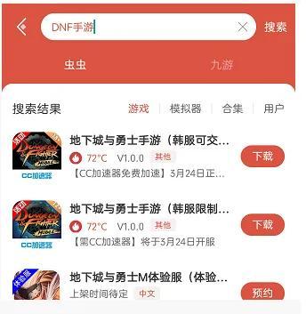 1、或者我们也可以通过虫虫助手的方式来下载地下城与勇士韩服,在搜索框内输入:DNF手游点击搜索;