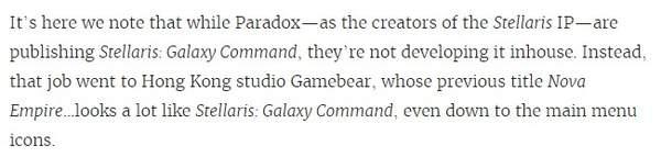 P社《群星》系列手游新作《群星:银河指令》在澳大利亚、加拿大等地的iOS和安卓平台开启Beta测试。不过这款游戏在不到一天的时间内就被下架,该作似乎盗用了343工作室的《光环4》的美术素材,而游戏的开发商则是国内工作室Gamebear。