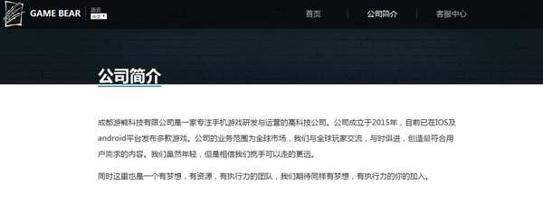 根据Gamebear官网介绍,这家工作室中文名为成都游熊科技有限公司,公司成立于2015年,目前已在IOS及android平台发布多款游戏。