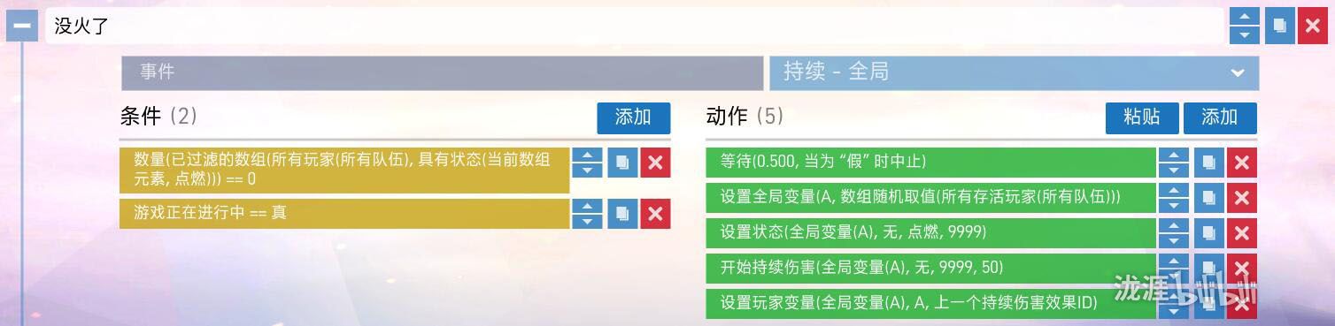 我们的条件应该是,当所有玩家都没有火的时候。换句话说,就是有火的玩家数量=0的时候。游戏并不能直接获取到有火的玩家,但我们可以利用“已过滤的数组”来做到这一点:我们从所有存活玩家里,筛选出有火的玩家,不就可以了?