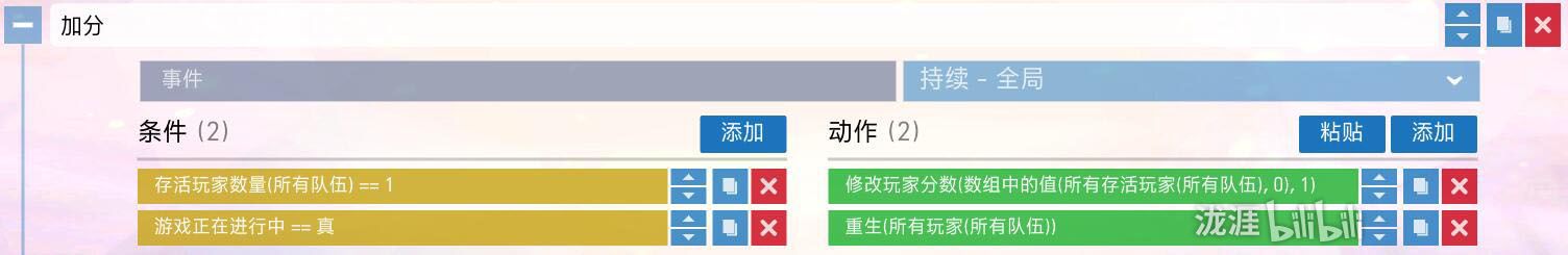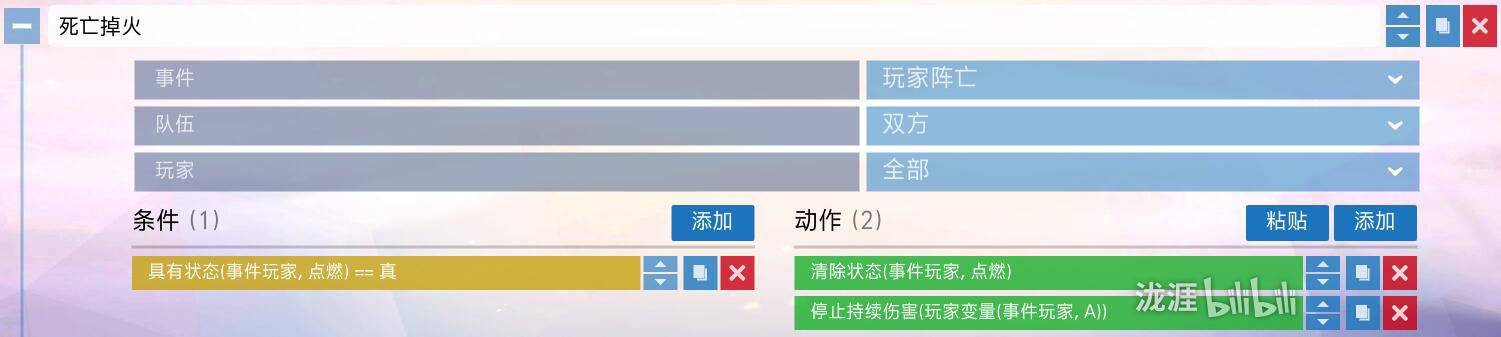 例如,我们可以用“存活”来判断玩家阵亡与否。而结合我们上面所说的持续事件,我们可以写出这样的规则: