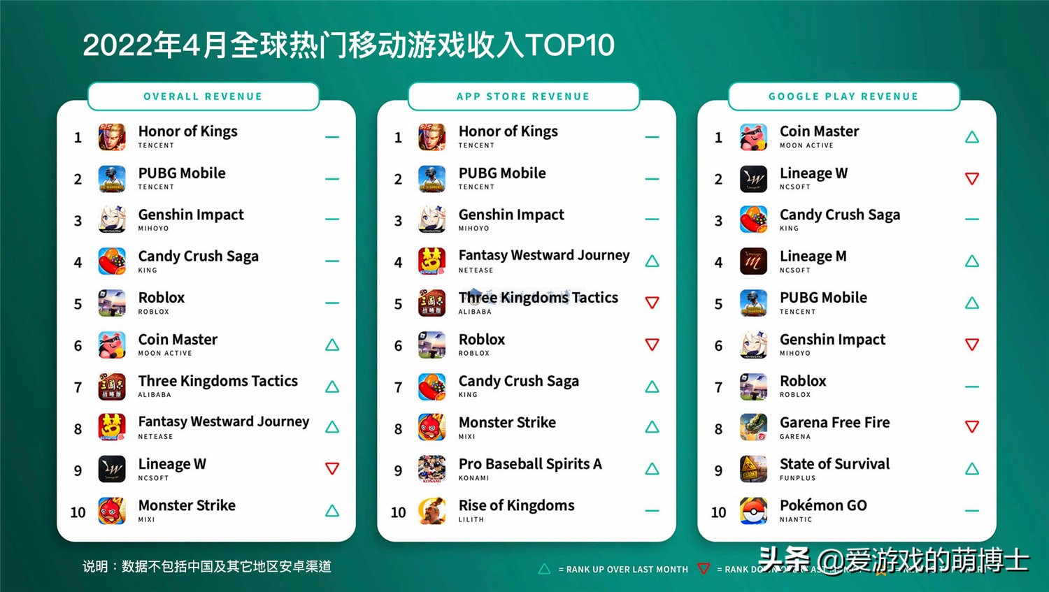 时间过得飞快!不知不觉之中,又到了每个月例行的介绍全球手游畅销榜的日子。博士还记得:2022年3月的时候,《王者荣耀》、《绝地求生手游》和《原神》位居前三甲;《宝可梦GO》以及《三国志:战略版》也给大家留下了深刻的印象,前者慢慢丧失了之前的统治力,在TOP10中已经没有位置,而后者海内外的成绩都不错,杀到了畅销榜第九名!