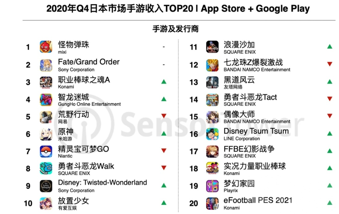 在2019年的时候FGO以11亿美元的成绩拿下了全球营收的第一,但是今年以来除了日本市场之外,营收都在不断下滑,截止2020年Q4为止,日服方面除了怪物弹珠之外,第二位基本就是FGO了。