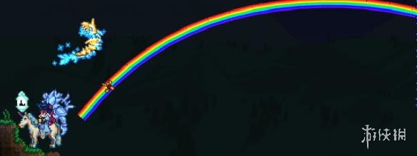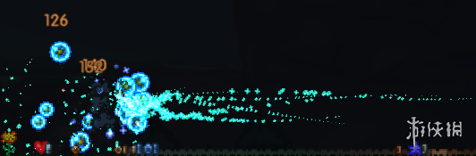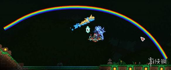 比彩虹水晶好用,虽然彩虹水晶面板上写着“疯狂的击退”,然而彩虹水晶还是会漏怪,这个攻击方式是一道月光扫射一排碾压过去。