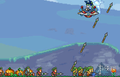 攻击方式是投掷他手上拿着的长矛,准头很差。地上的怪还行,飞行怪就很难打到了,比如晚上的眼睛和雨天的愤怒雷云。排排坐x4,这样很像身后跟着一排小弟。飞的时候踩着长矛,有的挂在长矛上。