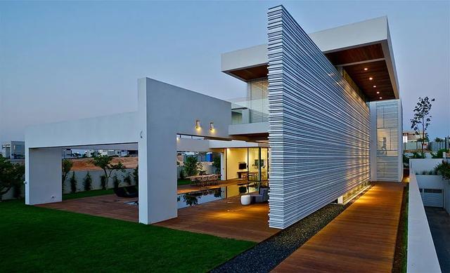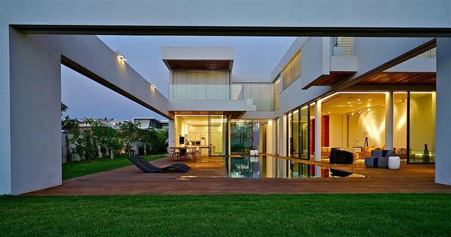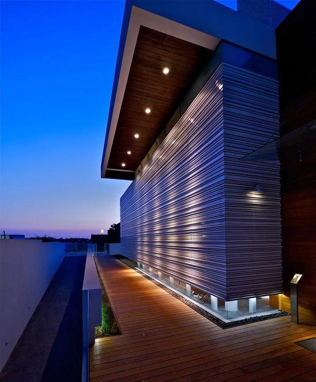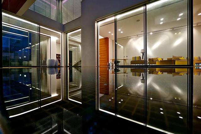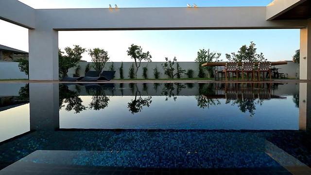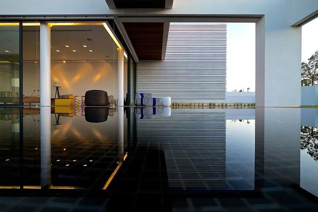 做法就是使用玻璃隔断取代传统的混凝土墙壁,并利用游泳池的远景,创造出无限延伸的视线错觉;因此从室外往内部看,水面不仅延伸了墙面,让建筑有放大的效果,又让房屋仿佛漂浮在水上,别有一番风情。