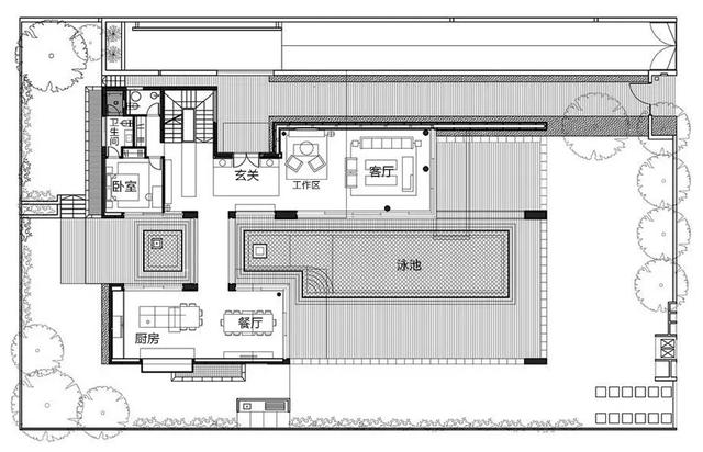 于是会发现,客厅、厨房、游戏室、泳池等主要的聚会空间,使用了大量的玻璃移门,除了将绿意引入室内,而且一旦移门开启之后,室内、室外就变成连贯的大空间,空间感更宽敞!
