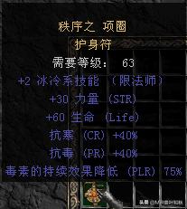 9,项链,在前面的基础上,项链我们可以用马拉,加抗性还带+2技能,当然,也可以用亮金戒指,它可以出75%降毒时效属性。