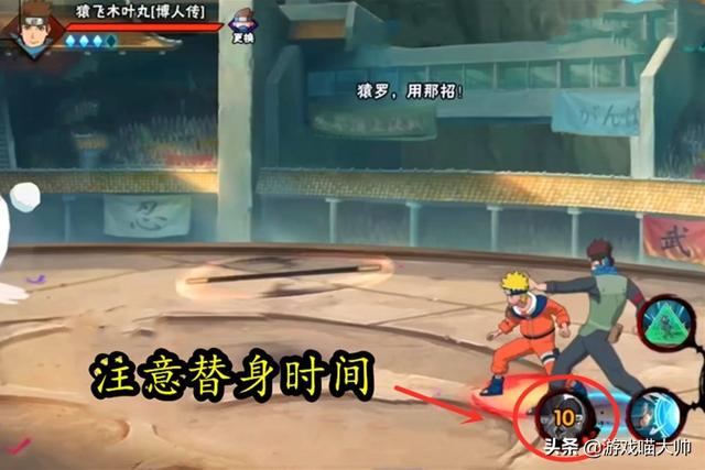 木叶丸想进入金箍棒模式就必须主动使用替身技能,届时猿罗会化身成金箍棒,从决斗场任意场地回到木叶丸手上,注意:回归阶段相当于一段技能攻击!替身进入冷却CD,为10秒!