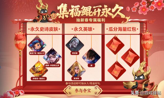 王者荣耀两大区服将会上线必得英雄皮肤的活动,需要注意的是两大区服参与方式不同,但奖励一致,比如微信区玩家可参与摇心愿,其中永久普通皮肤80选1、永久英雄97选1、稀有皮肤10选1,后者包含了赵云嘻哈天王、孙悟空地狱火、张良黄金白羊座等传说史诗皮肤。而手Q玩家则是以收集道具的方式获取皮肤(类似牛年的集福鲲),奖励同样包含了鲁班七号电玩小子、貂蝉仲夏夜之梦等高级皮肤。