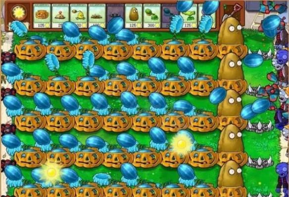 与前面相比,这个种植方法则更加的残忍,完全不让僵尸有喘气机会,先在最后排种下地刺王,然后种下高坚果与冰冻西瓜,最后套个南瓜头,僵尸出现之时,满天西瓜就会砸向僵尸,一出现就把僵尸秒了……