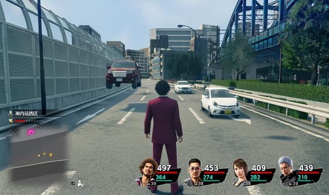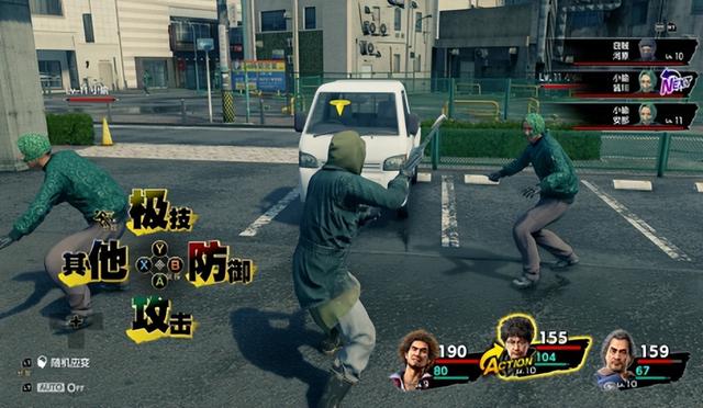 一是增加了环境互动要素。在战斗中,所有的角色会进行【随机走位】,你会看到角色之间互相提防的二人转,或是输出指令后从大老远特地跑来揍敌人一拳的己方角色。随机走位给战斗带来许多未知,AOE的输出也无法知道自己到底能打到多少人,敌人的攻击目标是谁也难以预测。这一机制提升了整个战场的动态感,不再是你一拳我一拳的传统形式,也能很大程度减轻原《如龙》玩家的不适感。这样的随机移动与环境之间具有一定配合,当路径上具有环境要素时,角色也会与其互动。这样一看还是继承了往代的“抡起自行车”战斗的画面。