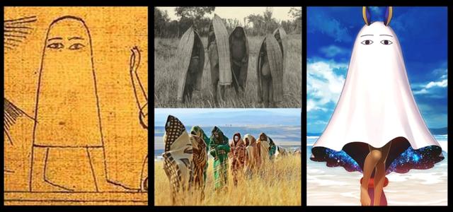 在这里我们会发现,这些南非部落成年仪式上的装扮,和梅杰德神的形象与描述简直出奇的相似,宽松的斗篷遮住全身,只留两只脚走路,被遮住的人等于隐形状态无法被看见。他们的成年仪式要割包皮,这和奥西里斯丁丁被鱼吃掉的神话一样,是一种象征性的阉割,因为现实中不可能真的挥刀自宫,另外在希腊神话中乌拉诺斯被阉割也是具有类似的含义。所有这些相似点绝非巧合,所有这些资料都显示出,梅杰德神很可能就是奥西里斯被鱼吃掉的丁丁,因此他也很可能是一个与繁育有关的男性生殖神。所以在亡灵书中他会出现在死者通向来世的道路上也就说得通了。