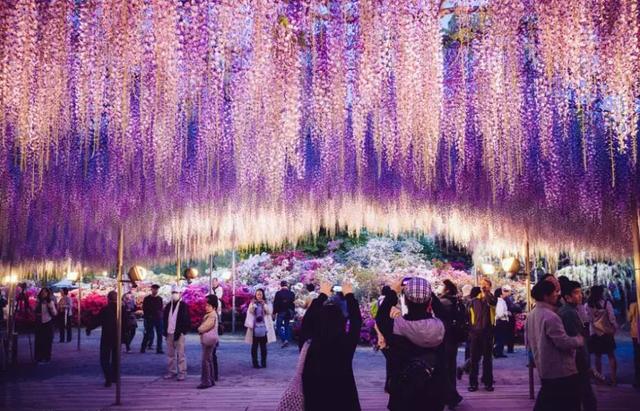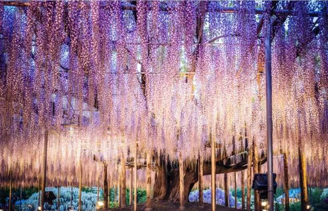 在日本栃木县足利公园的这株年近150岁的紫藤树,高15英尺,占地1672平方米,在金属支架的支撑下,蝴蝶状的花朵一簇簇,犹如紫色瀑布倾泻而下。伦敦设计师Peter Lourenco在此游玩时拍到了这震撼而壮美的画面。