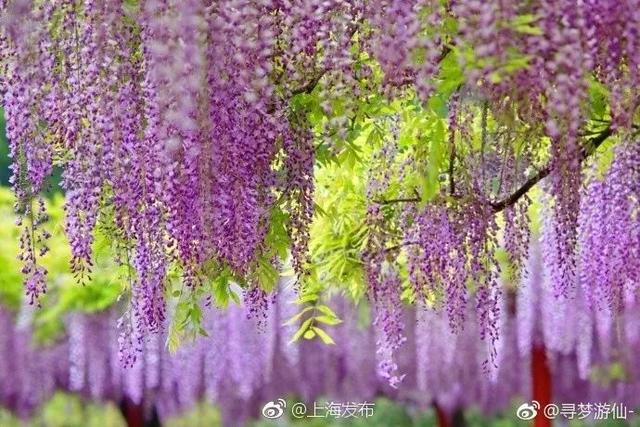 所以,小编掐指一算,本周末,紫藤花将迎来盛放期最佳观赏日,你将看到一串串沉甸甸的紫藤花朵密密匝匝垂吊下来,大片大片蓬勃绚丽,紫中带蓝,灿若云霞,热情奔放中又蕴含着内敛的梦幻神秘感。