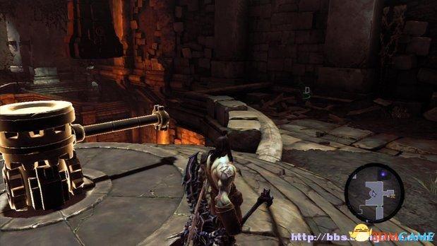 圣釜殿一层区域南部的双球谜题处,被闸门挡住的一个球体的右边