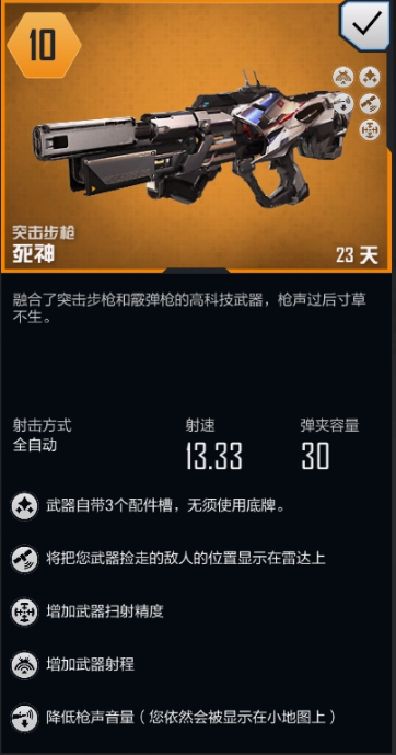死神是使命召唤OL全新的一把变形武器,能在步枪模式和泵动式霰弹模之间只有切换,其独有的新式抑制器是其枪械特色。作为唯一一把自带了枪口和瞄准镜依然是三槽枪的枪械,在配件方面可以很随意的搭配。泵动式霰弹枪加上突击步枪这样的组合几乎没有短板,绝大部分的地图,是一把适应性很高的枪械。