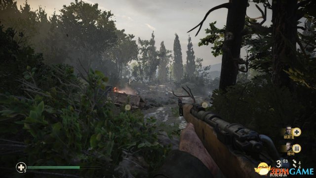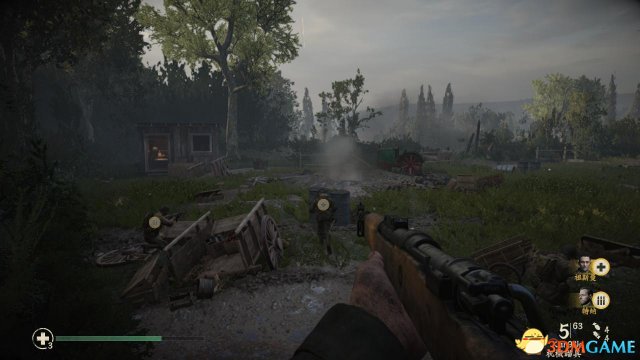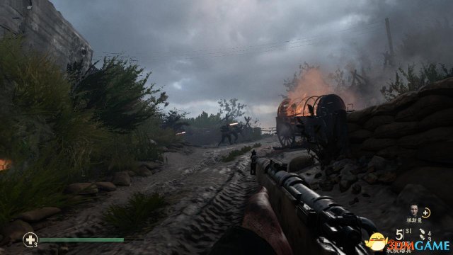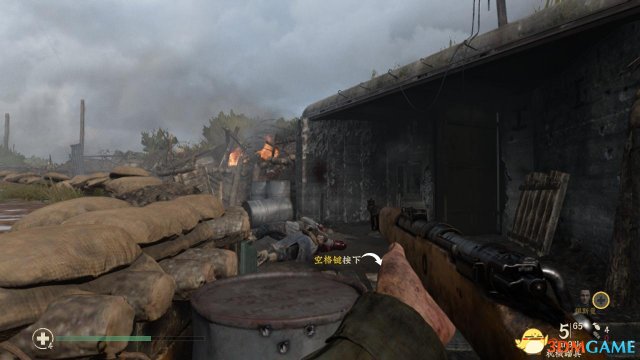 step4.顺着泥泞的山路往上走,遇到一辆着火的马车,就会出现一批纳粹兵,丹尼尔斯先躲在沙包后方射击,记得要蹲下,以免被爆头了。