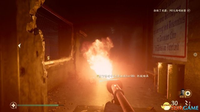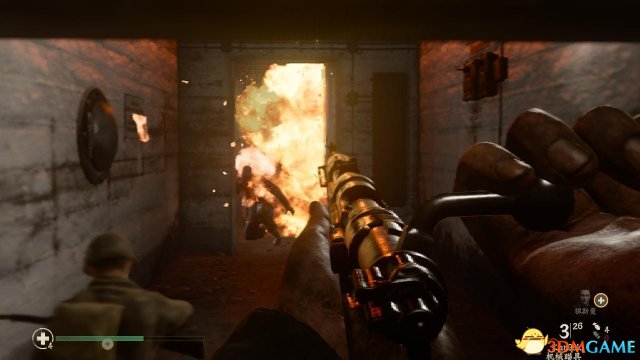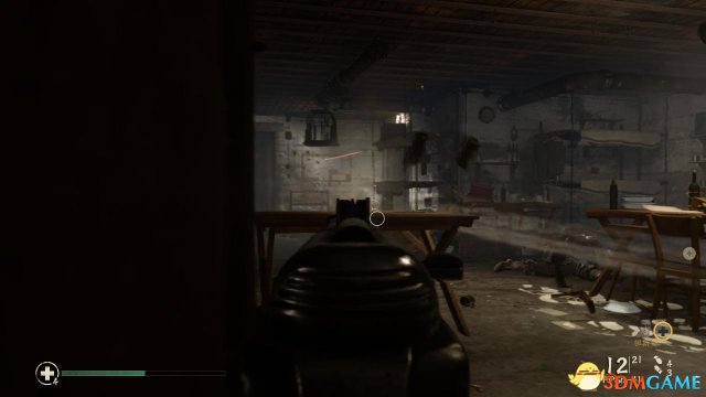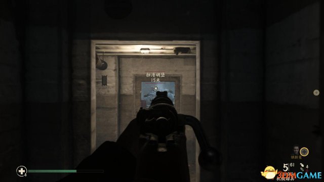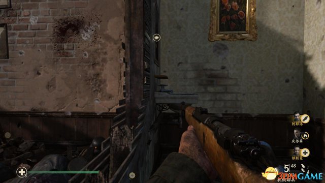 取出MG42后,可以在附近补充一下弹药,随后有一批德国佬从屋外杀进来,这时候丹尼尔斯将枪放在台上透过四方形的枪口进行射击,同时要当心有敌人从右侧溜进来(主要是让祖斯曼在外头吸引敌人)。