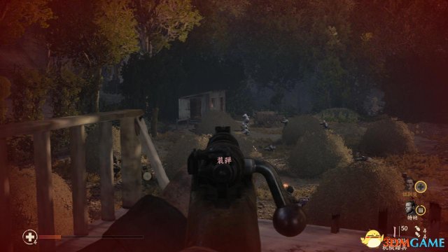 step10.然后登上建筑物的二层,取得Kar98k狙击枪,对着远处山头上的机枪手、Pak38炮塔旁边的汽油罐进行射击。