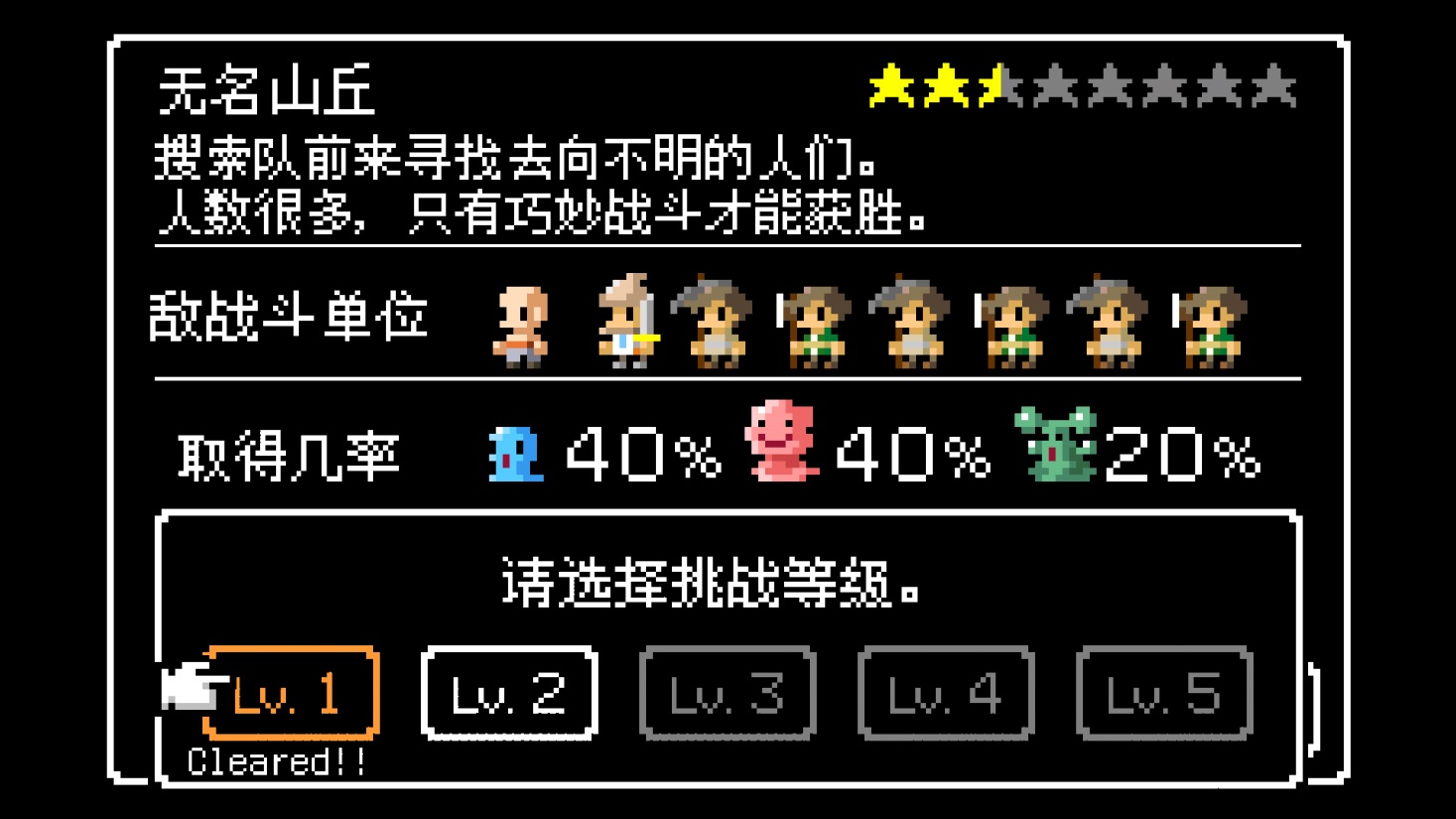 俗语说得好——"麻雀虽小,五脏俱全",这句话用在《史莱姆的野望》上面一点儿都不为过。别看容量只有30多Mb,该有的东西在这里面是一样都没落下,更是在传统战棋的创新玩法上加入了收集元素。游戏共分为四张地图,每张大地图里都有数个关卡,在开始攻略前,会有明确的提示关卡难度、本关敌人等信息,看到这里可能会有人奇怪,也没什么不同嘛,注意看,这里还有个最重要的信息,那就是史莱姆的取得概率。是的,各种各样的史莱姆都是要靠通关来收集的,而且在通关普通模式后,还可以进行挑战模式,玩家自己选择挑战难度,难度越大,收益越高。这样在战棋游戏中加入收集元素的设计,更好的吸引了不同玩家,同时提高了游戏性。