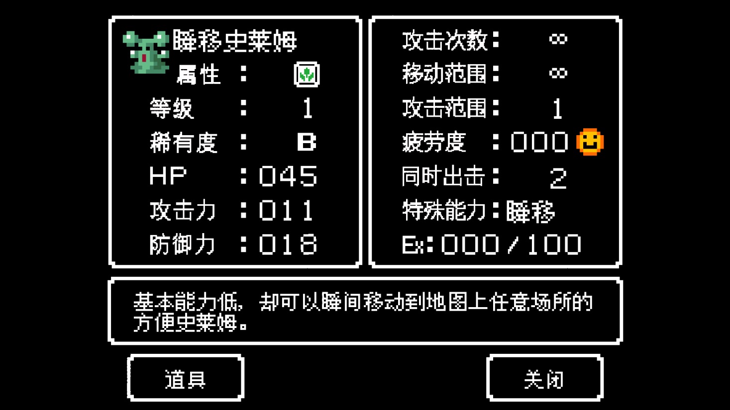 《史莱姆的野望》那浓浓的像素风让人一眼就回忆起FC上《勇者斗恶龙》时代,和邻家小哥一起打怪兽升级的美好日子,魔性的midi声效和BGM能够把人一下就拉回童年美好的回忆中。千万不要以为这款游戏只是把主角的勇者和怪物史莱姆调换了个位置,这样简单的话,还对得起废寝忘食熬夜写评测的笔者么?虽然依旧是战棋类RPG游戏,但玩家完全不可以像《兰古瑞萨》、《皇家骑士团》等经典战棋那样妄想把手中的史莱姆通过修炼升级来变大变硬——在《史莱姆的野望》中,最大的特色就是史莱姆们需要占据对手的身体,从而利用其身体的能力来完成攻略。