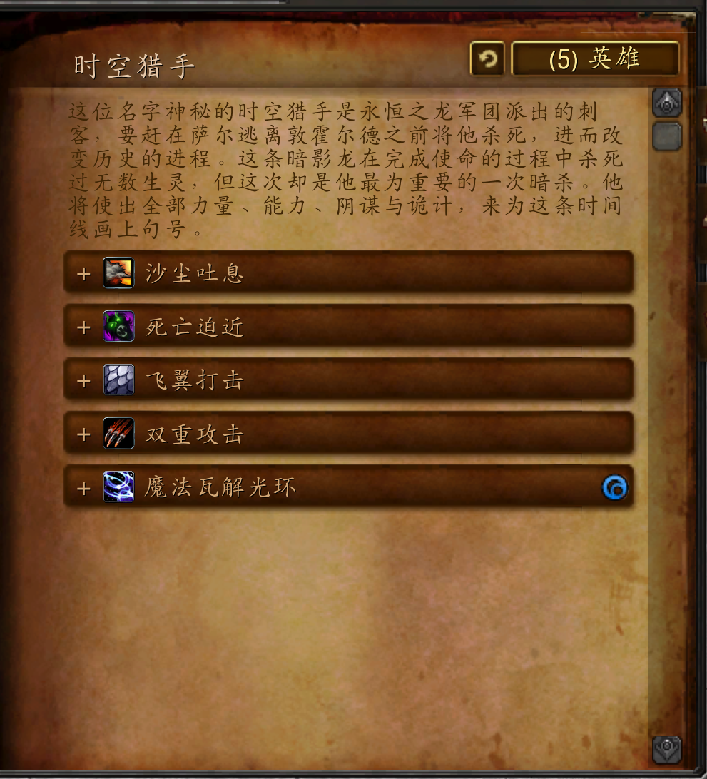 这位名字神秘的时空猎手是永恒之龙军团派出的刺客,要赶在萨尔逃离敦霍尔德之前将他杀死,进而改变历史的进程。这条暗影龙在完成使命的过程中杀死过无数生灵,但这次却是他最为重要的一次暗杀。他将使出全部力量、能力、阴谋与诡计,来为这条时间线画上句号。