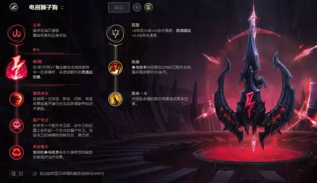 符文方面,狮子狗依然会是电刑狮子狗为主,点出猛然冲击。次选天赋就是精密系的凯旋和致命一击,用来提升秒人的效率,符文一般都是以最大化伤害为主,秒掉C位是狮子狗最重要的目的。