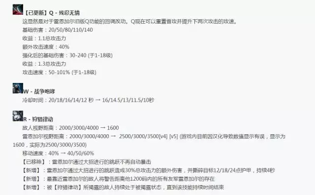 先来看看改动方面吧,改动主要集中于Q技能和R技能,Q技能是完整回调,以前的攻速加成也回来了,伤害非常爆炸。其次就是R技能的调整,现在跳出去的那一下不再带有暴击效果,而是会造成总攻击力30%的伤害,还附带破甲效果,对于狮子狗的伤害提升也是比较大的。