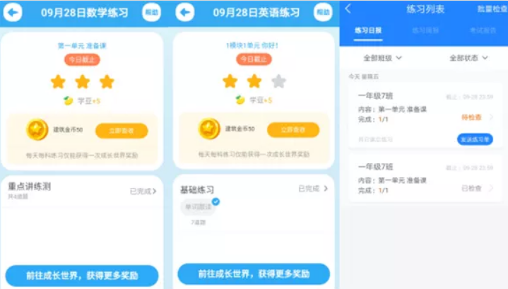 记者下载了“一起小学老师”APP,输入手机号即可注册。借助注册后生成的“老师号”,记者成功登录了“一起小学学生”APP,首页下方很醒目地列着“成长世界”“练习记录”“家长奖励”三个选项。
