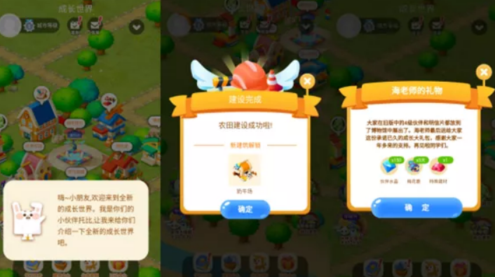 记者发现,这个“成长世界”和开心农场游戏类似。其中,“建筑中心”可以建造农田、奶牛场等;“伙伴家园”可以养梅花鹿、驼仔,还可以选派宠物和对手竞技。