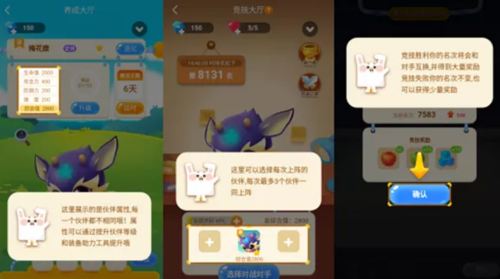 “伙伴家园”可以养成梅花鹿、驼仔、羊仔,还可以选派宠物和对手竞技。