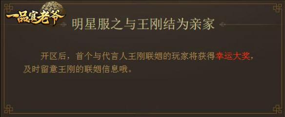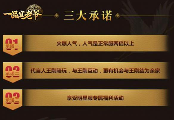 《一品官老爷》明星服承诺将会成为最火爆的服务器,还有五大福利活动限时开启:在线福利,元宝福利,充值排行,定时全服福利等,而且,你有跟王刚老师结为亲家的机会,而且,如果你是王刚老师的第一个亲家,还会手游神秘奖励。这么好玩的服务器,怎么可以错过,赶紧来预约吧!