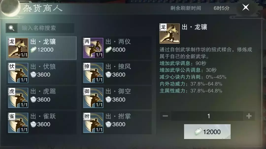 招式获取的途径有很多,包括副本、NPC商人、活动等等,这些招式除了外观不同外,其基础特性上限也是不同的,例如:龙骧出招的内外功和主属性加成的上限是64.8%,而伏狼出招的上限只有50%,所以尽可能选择一个上限高的招式。