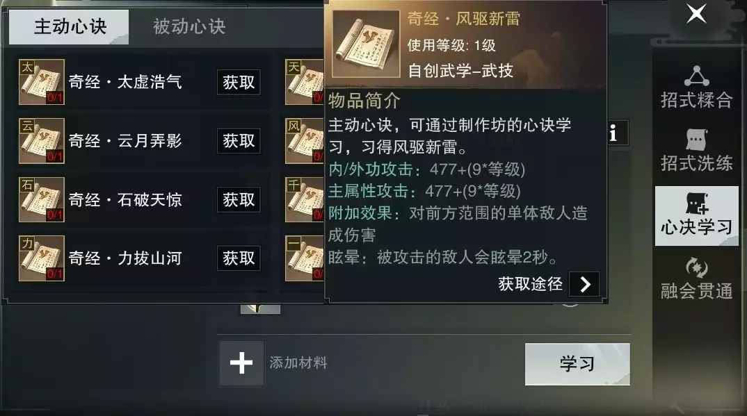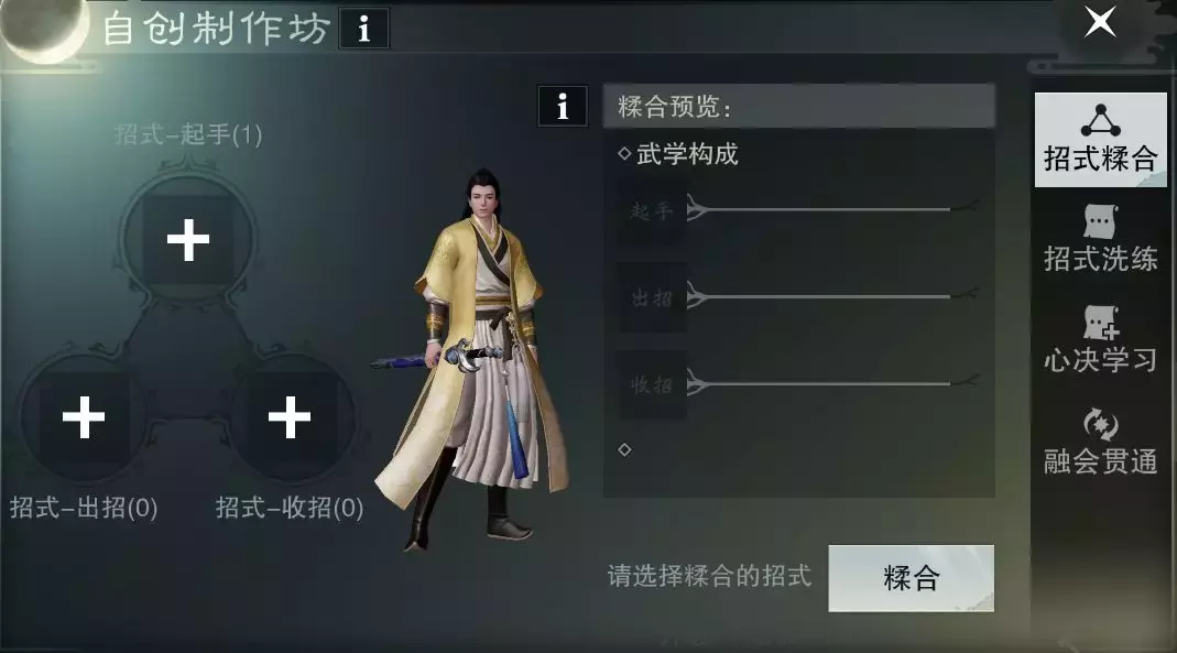 一般来说,自创一门绝学的流程是:1.招式获取、2.招式洗练、3.招式糅合、4.心诀学习、5.融会贯通