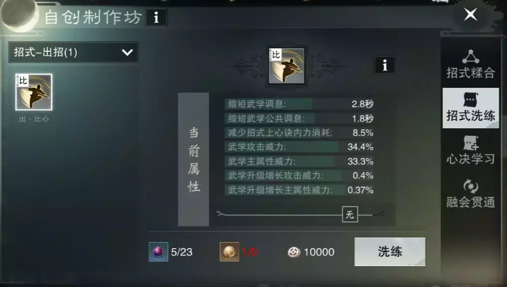 当我们选择好招式后,可以通过洗练对招式的基础特性(调息、属性附伤、内外功加成、心诀孔等等)进行提升,使最终达到的效果最佳。其中心诀孔最重要,一个招式最多可以获得3个心诀孔,同学们可以这样理解,招式是一件装备,心诀孔就是宝石镶嵌孔。