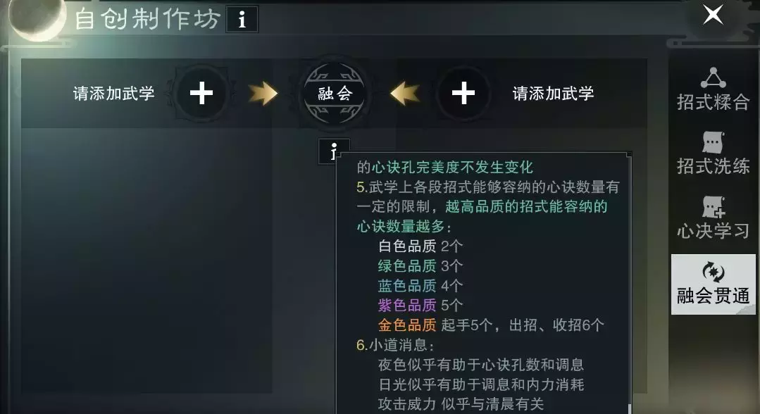 即两个武学技能合并成一个,根据官方介绍,合成后的武学会在原武学的基础上随机继承,由于没有经过实战测试,只能猜测合成后的武学上限会提升,尤其是在心诀数量上,金色品质起手招式可以拥有5个,出招和收招可以达到6个。