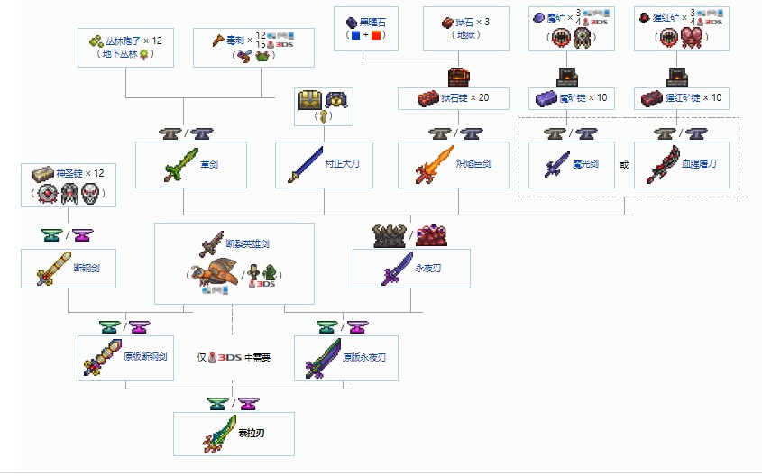 泰拉之刃是一把合成武器,它的合成公式较为复杂,由多把剑合成制作,具体合成方法如上图