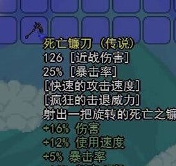 泰拉瑞亚死神镰刀的性能介绍 图文详解。死神镰刀是一把掉落于日食生成的死亡收割者的近战武器。跟大多数与它同级的近战武器一样,它能够远程攻击。。但是还有一部分玩家不是很了解死神镰刀,所以小编就给大家介绍一下。