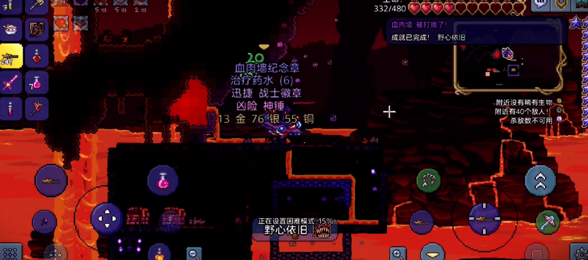 在打败旧三王之后,前往地狱,会发现有些小鬼的脚下抓着一个玩偶,击败这样的小鬼,玩偶就会掉下来,名字叫“向导巫毒娃娃”,在保证向导存活的情况下,将巫毒娃娃丢进熔岩里,肉山就会出现了。击败肉山需要在地狱中建立一个比较长的跑道,不然到处是岩浆没有办法走位,难度会大大提高,击败肉山之后,就会进入全新的世界啦。