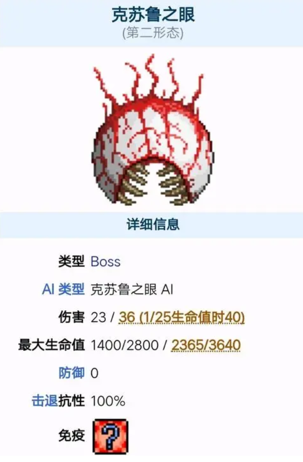 最后是克苏鲁之眼,召唤方式很简单,只需要用10个晶状体合成召唤物就可以了。方法和世界吞噬者一样,在夜晚使用召唤物即可召唤出克鲁苏之眼。打的方法和世界吞噬者一样,搭建平台左右走位躲避攻击技能就可以了,血量不厚。整体来说旧三王就是给玩家练手的,所以整体难度很低,但是对于很多新手玩家来说,怎么召唤反而成了最困难的事情。