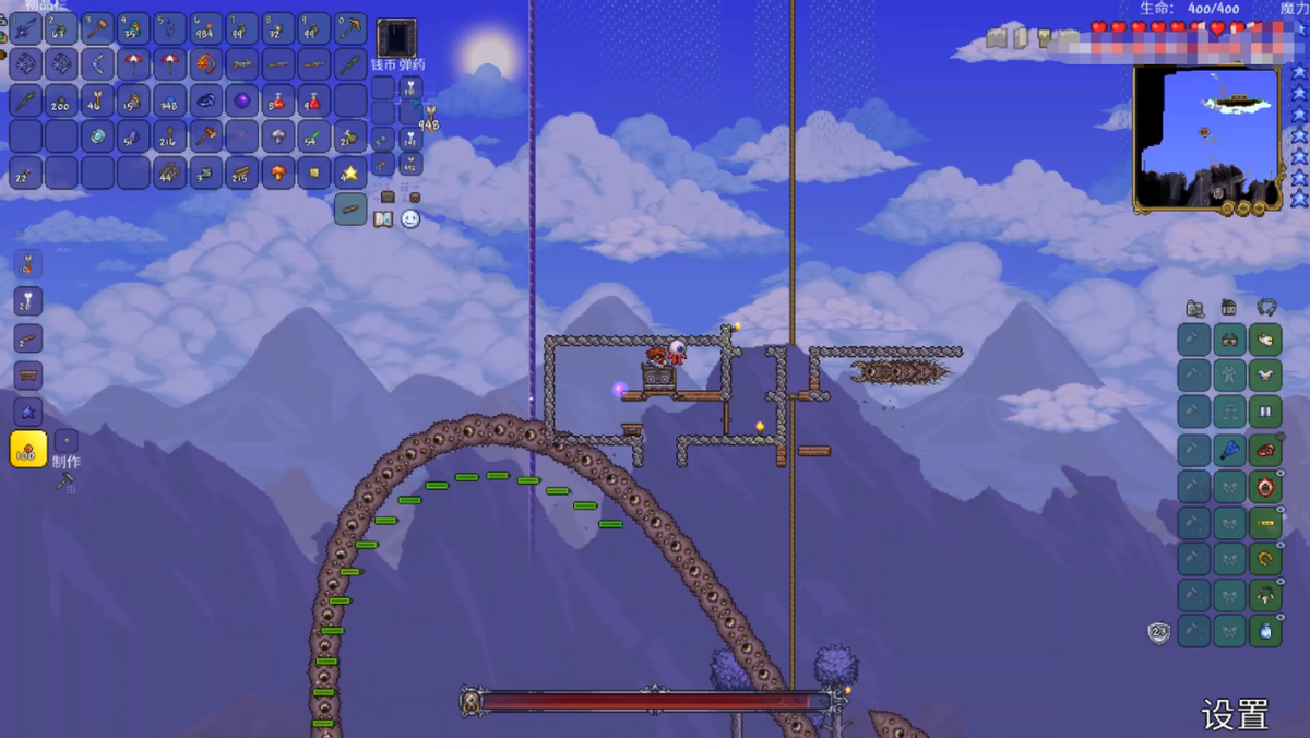 首先旧三王分别是世界吞噬者、骷髅王、克苏鲁之眼,先来说世界吞噬者,世界吞噬者的召唤物需要用15个腐肉和30和邪恶粉末。在腐化之地下面在腐化祭坛处合成召唤物,在夜晚使用召唤物,即可召唤出世界吞噬者,像一个大长虫子一样,击败方法很简单,在地面上建造足够高的平台就可以了,世界吞噬者飞行高度是有限的,很简单就可以做到无伤打败。