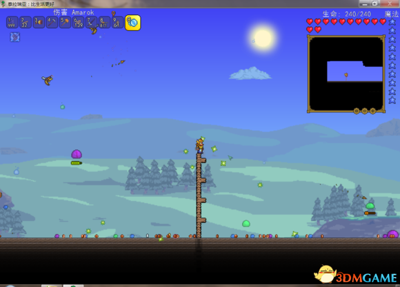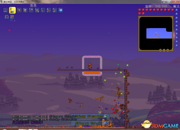 平台get,我用召唤物打的,新手可以使用远程武器如弓,枪等。wiki上说史莱姆王最高只能跳17格,所以这个平台高18格,屎王根本够不到你。ps.不要在意泡泡