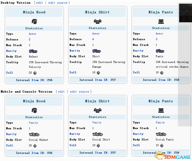 可以看到,忍者套在pe版仍然是时装,在pc帽子、盔甲,裤子分别加成2/4/3的防御以及15%/15%/10%的投掷伤害加成。
