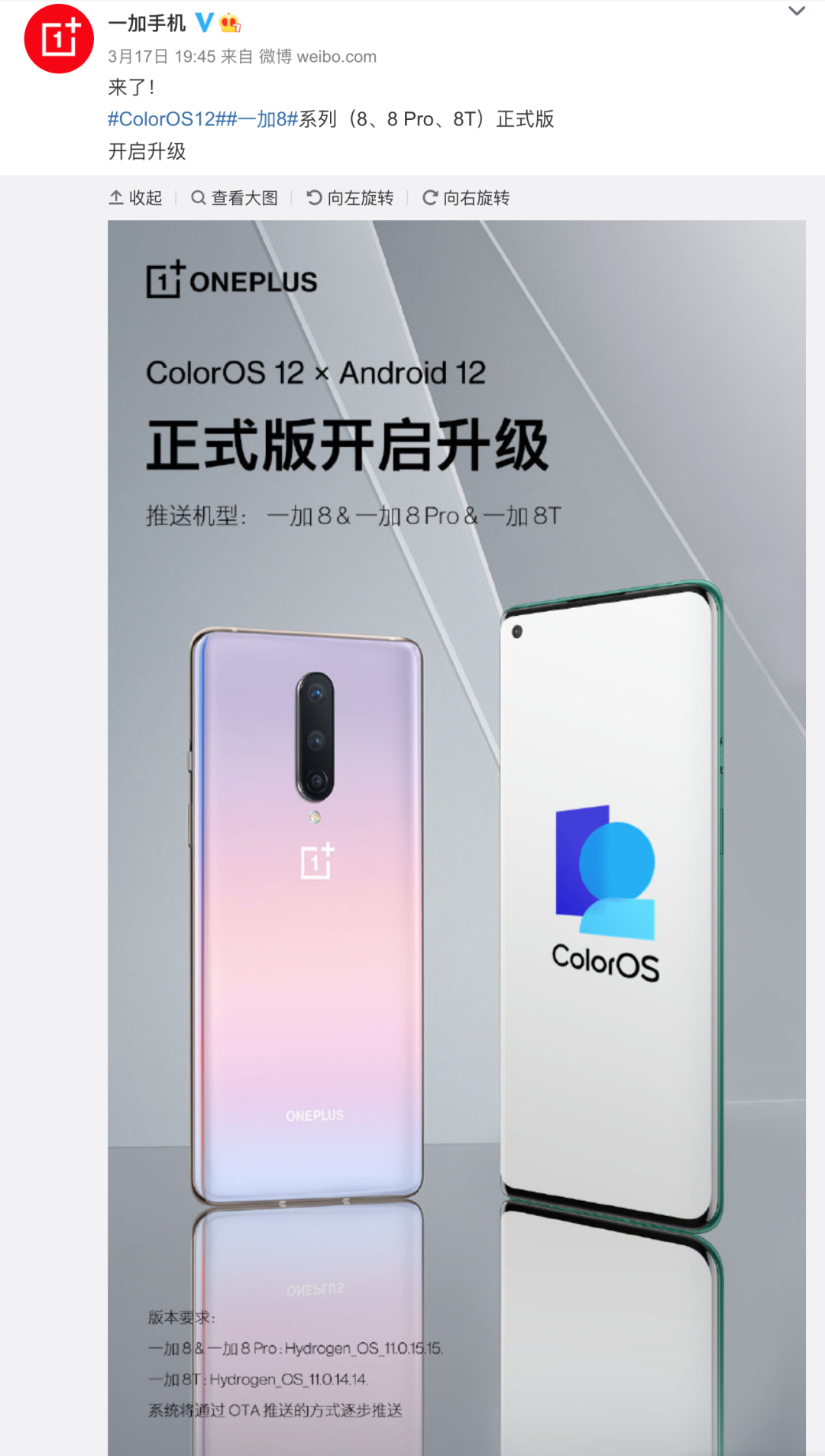 近两年吧,一加手机在系统更新进度上收到不少吐槽,2021年9月份OPPO发布了全新ColorOS12(关于ColorOS12具体功能UI等戳蓝字跳转回顾),当时预告的是一多款加机型预计会在2022上半年推送,现在一加8系列的更新确实如约而至。