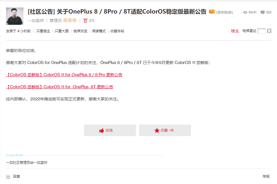 IT之家 7 月 9 日消息 一加管理员今日在社区发布了一份公告,表示经过内部确认,一加 8、一加 8 Pro 和一加 8T 可于 2022 年正式更新 ColorOS 稳定版。